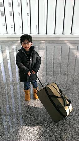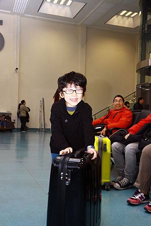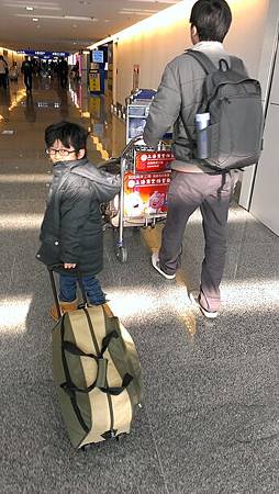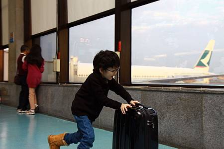 在等待的時間,lucas愛上推行李箱,拿著嫻姊姊的行李箱,推來推去。