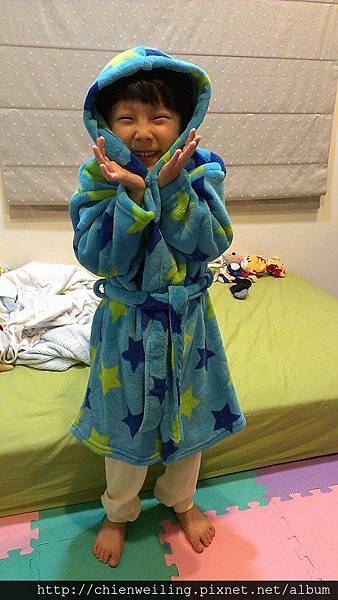 【學大人穿浴袍】我和把拔都有大浴袍,LUCAS看了也嚷嚷,他說這個好舒服好想有一件~於是馬麻就在next購買一件給LUCAS,穿起來還蠻像毛怪的~一穿上去,笑容停不了…