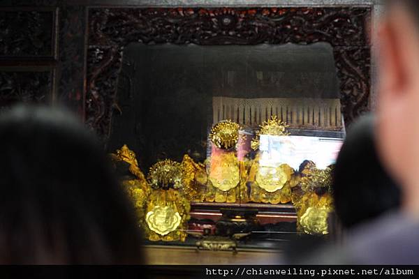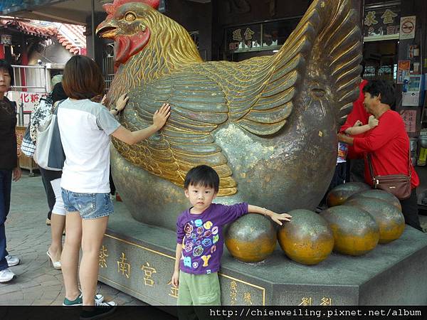這間是求財的廟,所以有金雞母和金雞蛋,摸了會發財喔~,綸綸也趕緊試試,上面的金漆都被摸到掉了…